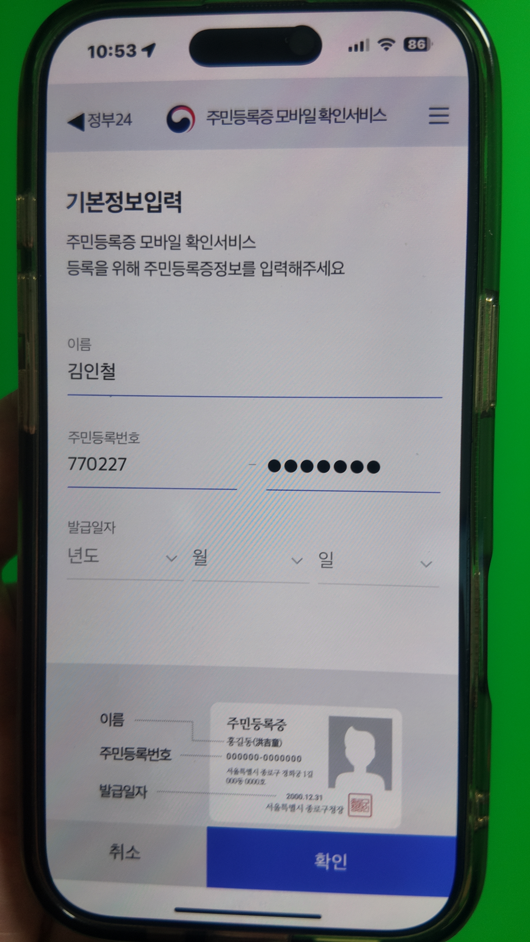 4. 주민등록 정보 입력 (성명, 주민등록번호, 발급일자 등)